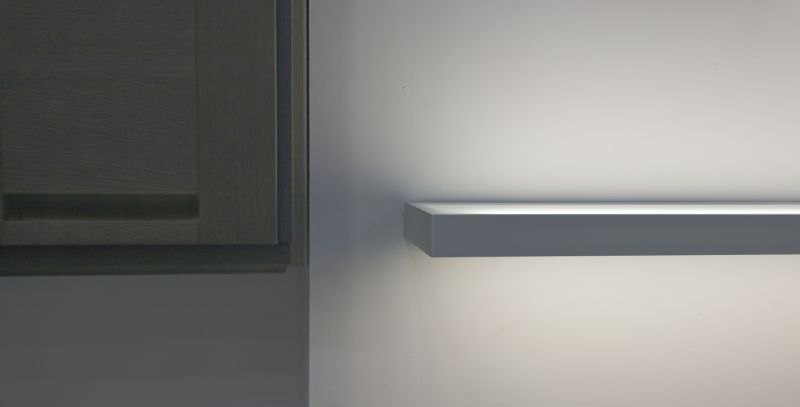 Cocina en roble frances con un barniz ceniza y el tirador incorporado. Encimera en formica imitando a una pizarra gris. Sistema Hewil de alzamiento doble. Detalle de baldas luminosas en 5cm. Cocina instalada en nuestra exposicion de cocinas de madera en Madrid. (Humanes)